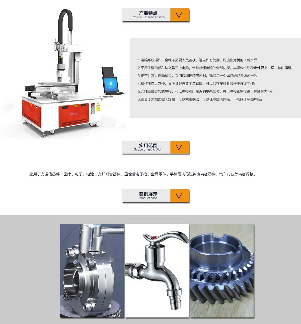 多軸連動激光焊接機 產(chǎn)品優(yōu)勢 1.電腦系統(tǒng)操作,全程不需要人員監(jiān)視,通電即可使用,焊接出完美的工件產(chǎn)品; 2.采用先進(jìn)的新科技微型工控電腦,代替普通電腦的全部功能,其操作性和穩(wěn)定性更上一層,與時俱進(jìn); 3. 穩(wěn)定性高,自動聚焦,采用雙閉環(huán)精密控制,確保每一個焊點的能量均勻一致; 4.操作簡單、方便,界面參數(shù)設(shè)置簡單易懂,可以保存多條參數(shù)便于連續(xù)工作; 5. 六軸三維旋轉(zhuǎn)式焊接,可以焊接難以接近的復(fù)雜部位 ,并且焊接緊密度高,熱影響力?。?6. 適合于大幅面空間焊接,可以六軸聯(lián)動,可以任意空間焊接,不局限于平面焊接; 應(yīng)用行業(yè) 應(yīng)用于光通信器件、醫(yī)療、電子、電池、光纖耦合器件、顯像管電子槍、金屬零件、手機震動馬達(dá)鐘表精密零件、汽車行業(yè)等精密焊接;